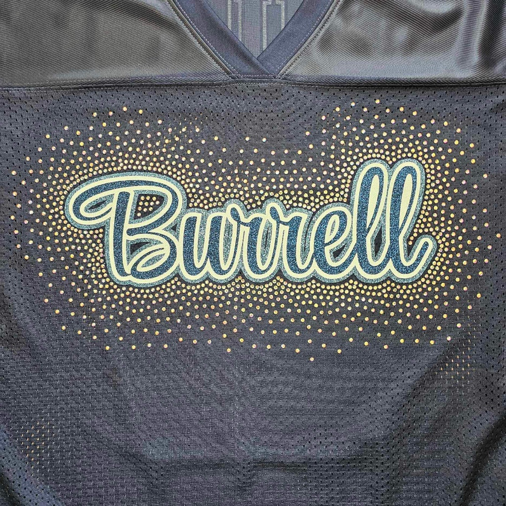 This glamorous design features 3 colors of glitter "Burrell", surrounded by stunning rhinestones. Cheer on your team with confidence and stand out from the crowd.