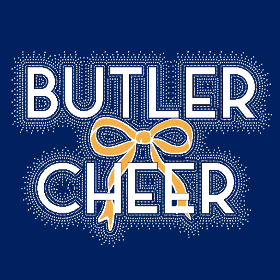 Butler BAMFL over Cheer with Bow in glitter & rhinestones around. This design is a mockup and actual design will be much more sparkly and spectacular!