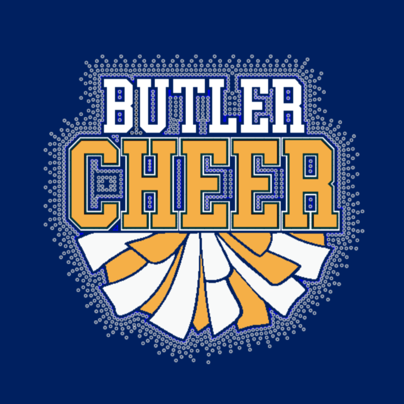 Butler BAMFL CHEER with Pom in glitter & rhinestones around. This design is a mockup and actual design will be much more sparkly and spectacular!