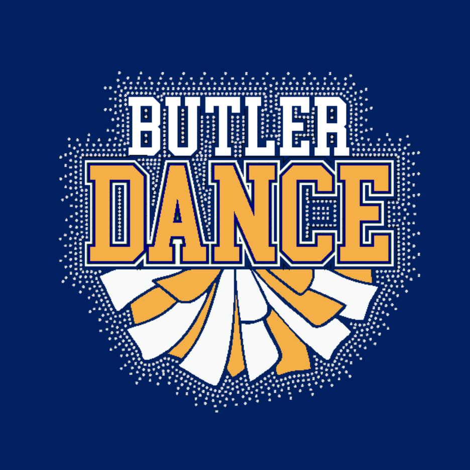 Butler BAMFL over DANCE with Pom in glitter & rhinestones around. This design is a mockup and actual design will be much more sparkly and spectacular!