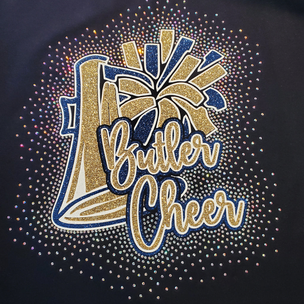 This stunning design features two colors of glitter and is surrounded by stunning rhinestones. Cheer on your team with confidence and stand out from the crowd. PLEASE NOTE: DESIGN COLORS MAY BE INTERCHANGED TO SHOW UP BEST ON SHIRT COLOR SELECTED.