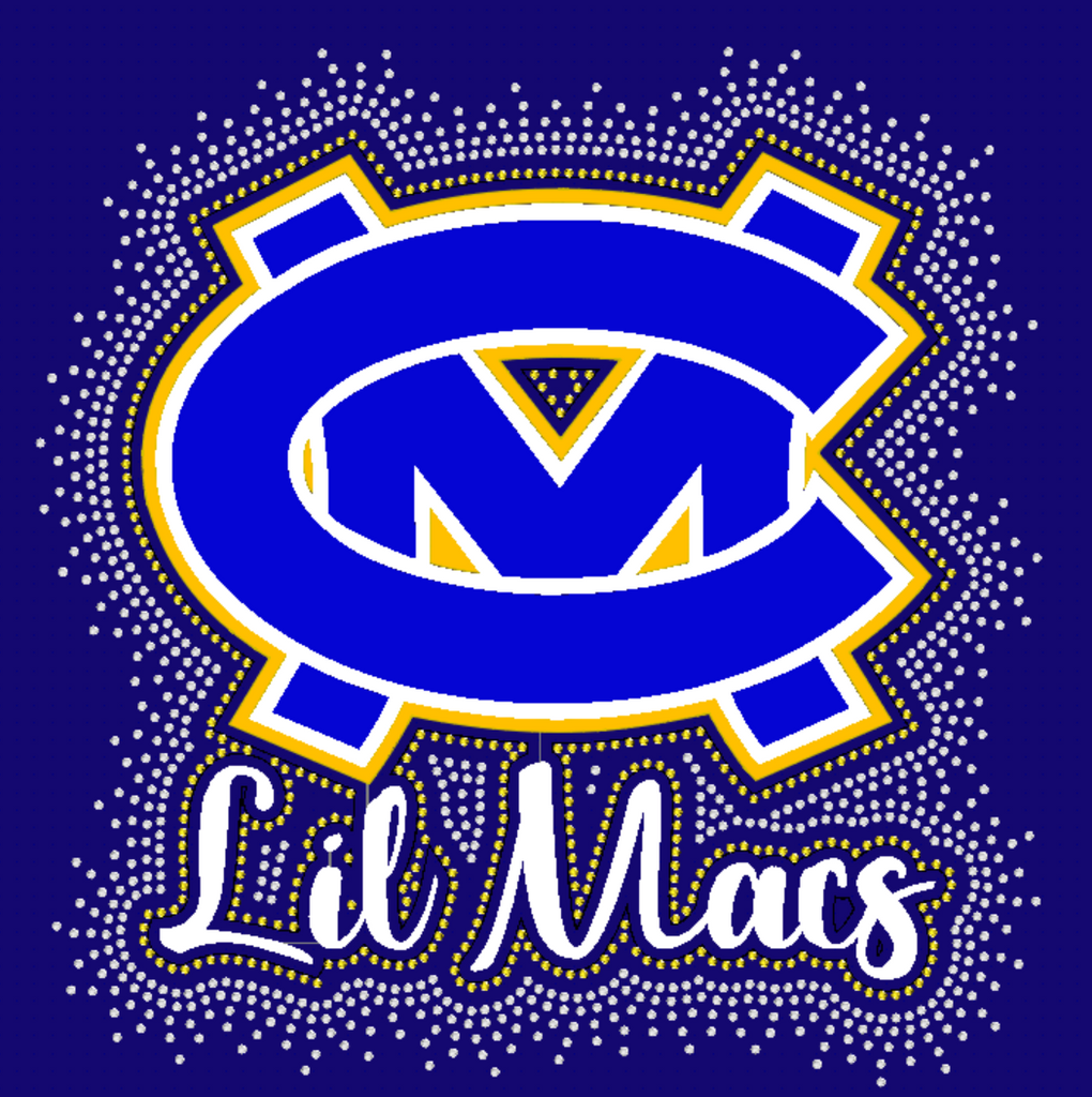 This glamorous design features the classic CM logo over Lil Macs in a script front, dazzling rhinestones, and sparkling glitter in three colors. Cheer on your team with confidence and stand out from the crowd.
