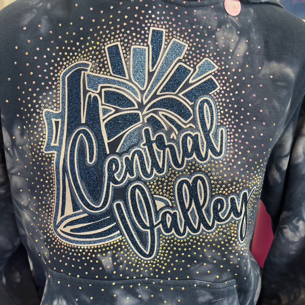 This glamorous design features a pom and megaphone overlayed with the Central Valley words in script. The entire design is 3 sparkly colors of glitter with a rhinestone outline. Cheer on your team with confidence and stand out from the crowd.
