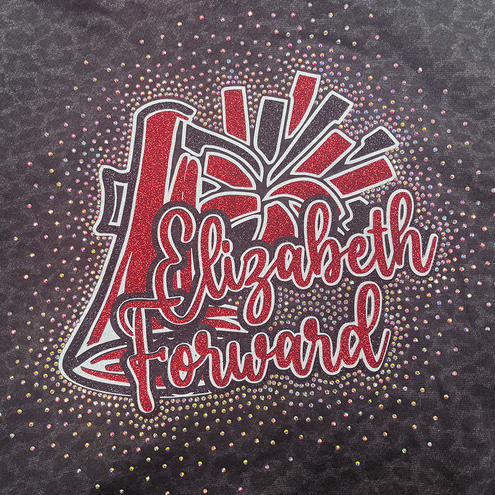 Celebrate your Elizabeth Forward Warriors pride with this eye-catching megaphone design featuring three colors of glitter and sparkling rhinestones.
