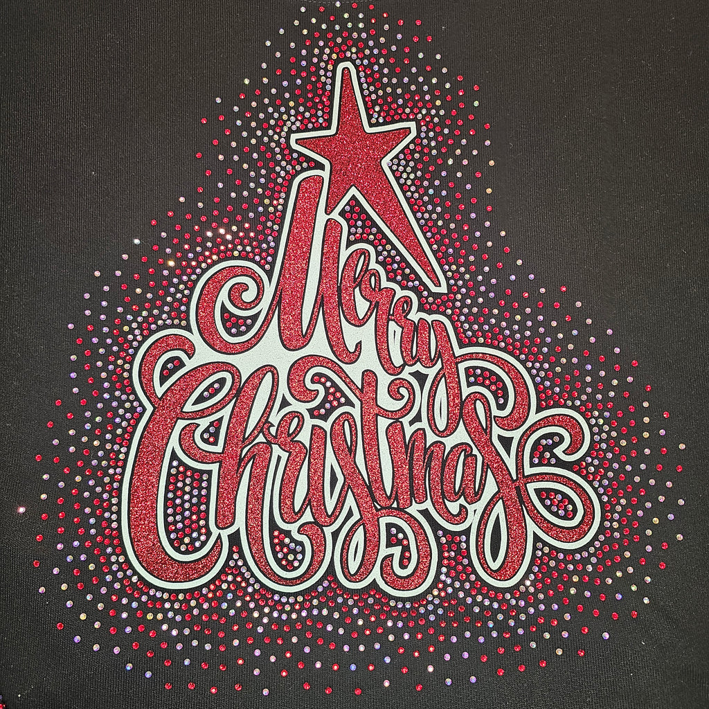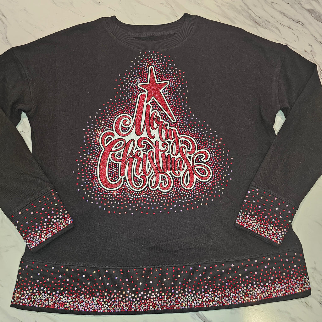 This design is available in red and white as shown or green and white (not yet pictured). If you would prefer green instead of red, please leave a note in the comments when you pay. If you would like the sweatshirt pictured (which is a black crewneck with small slits up each side and slightly longer in the back), please select the Ladies Relaxed Crewneck. If you would like the extra rhinestones along the bottom edge and the sleeves, be sure to select both of those as well. This will be a quick turnaround shirt so you have time to wear it before Christmas!