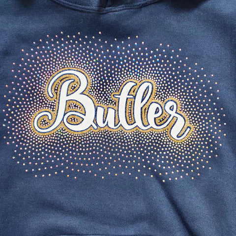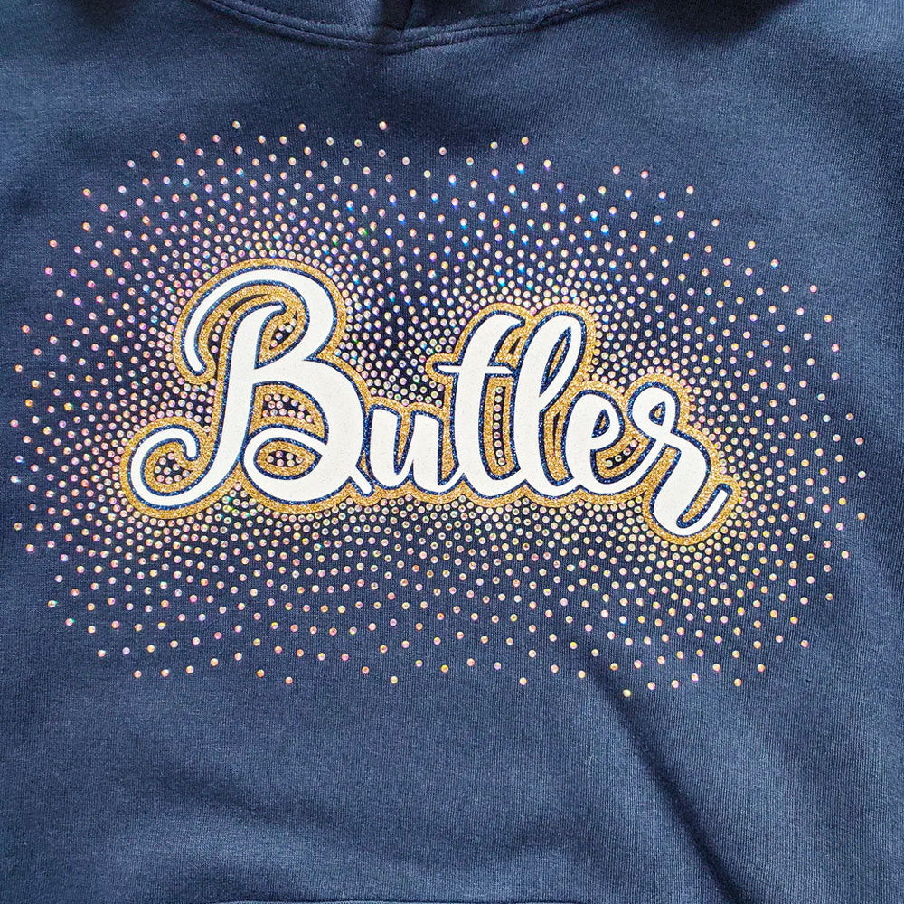 This stunning design features two colors of glitter and is surrounded by stunning rhinestones. Cheer on your team with confidence and stand out from the crowd. PLEASE NOTE: DESIGN COLORS MAY BE INTERCHANGED TO SHOW UP BEST ON SHIRT COLOR SELECTED.